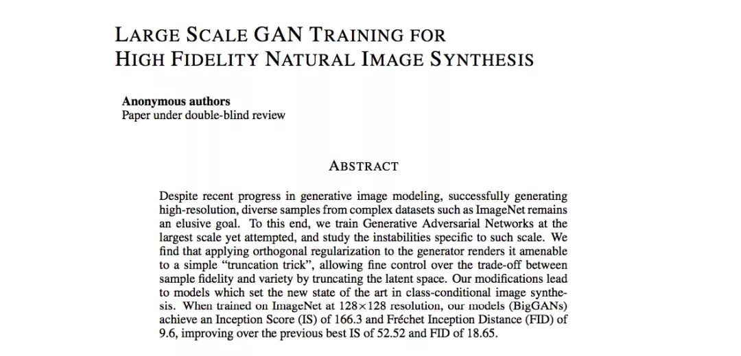 编者按:几个月前,论智介绍了图像生成领域的一个巨大进展:SAGAN。在那篇论文中,罗格斯大学和Google Brain的研究人员大胆把NLP中的self-attention模型引入GAN,解决了特征记忆问题,把图像生成的初始分数(IS)从36.8一下提到了52.52。而近日,一篇ICLR 2019的Open Review论文(赫瑞-瓦特大学&DeepMind)带来了更震撼结果,他们把IS一下子提高了一百多分,从52.52提升到了166.3。