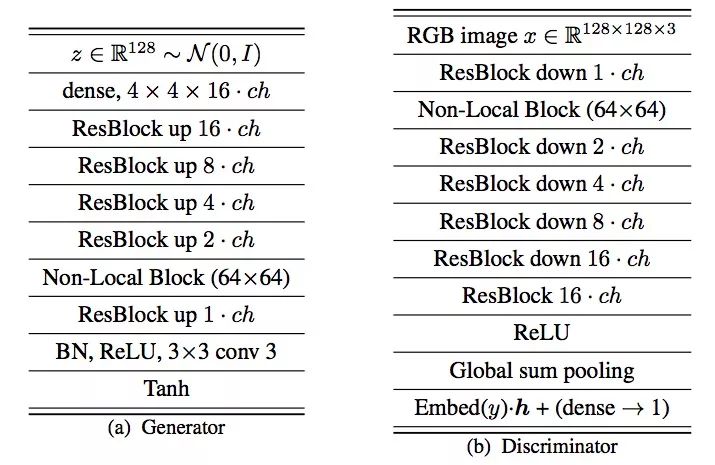 本文提出的BigGAN遵循了SAGAN的基本架构,它基于ResNet,但判别器D中的通道和一般ResNet不同,每个模块的第一个卷积层的filter数量等于输出的filter数,而不是输入数。