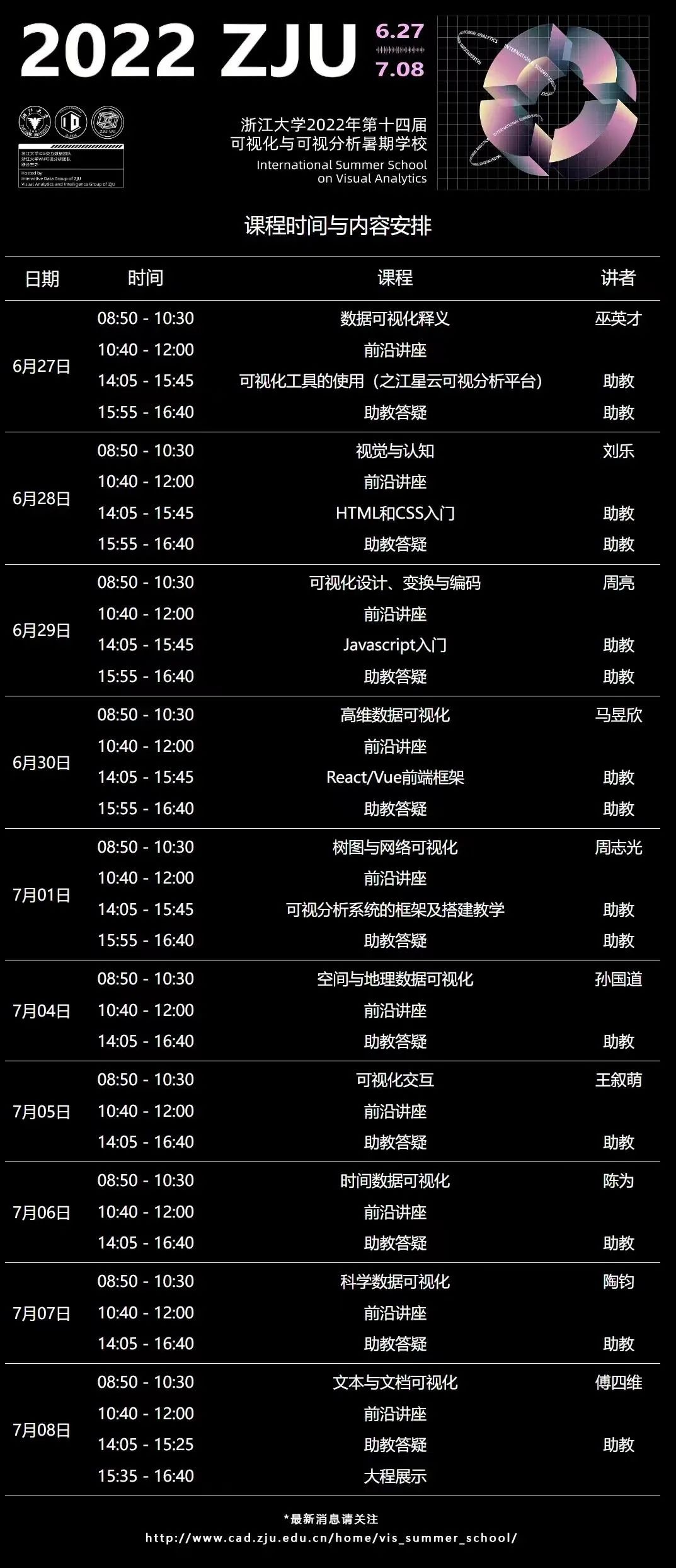 第14届浙江大学可视化与可视分析暑期学校将采取线上、线下结合的方式举行,并且面向全国学生授课。