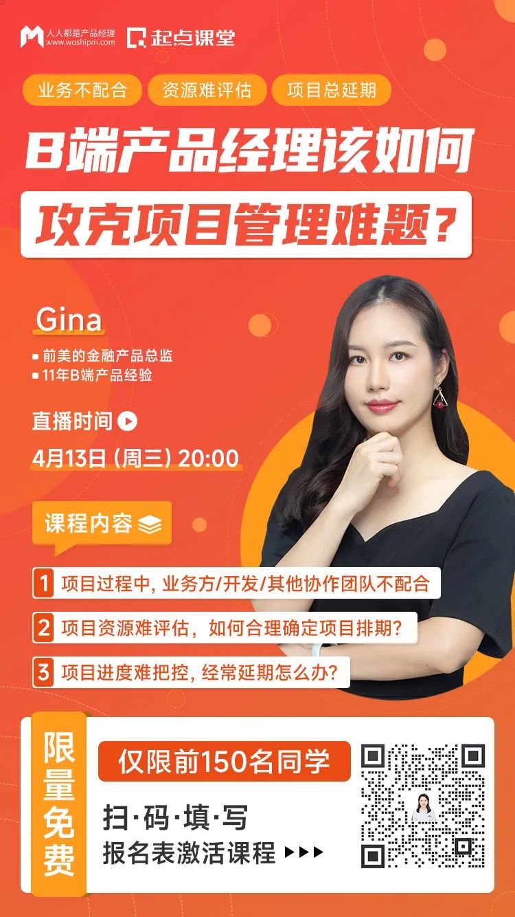 这是由起点课堂出品的B端产品公开课,专为正在做B端产品同学,或者对B端产品感兴趣想要了解相关工作内容的同学打造,课程将由前美的金融产品总监@Gina直播授课。