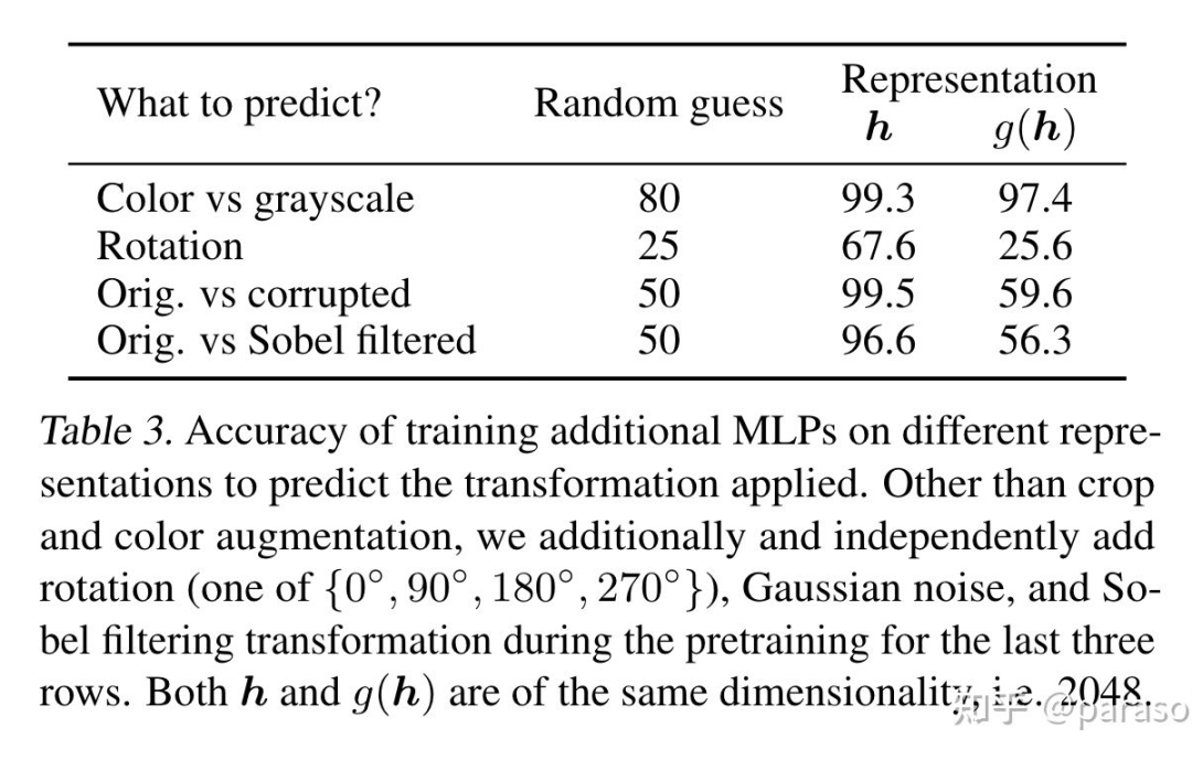 作者认为是 g 被训练的能够自动去掉 data transformation 的噪音,为了验证这个猜想,作者做了这个实验:用 h 和 g(h) 来区分做了哪种 data transformation,从下面第二张实验结果图看出,h 确实保留了 data transformation 的信息。