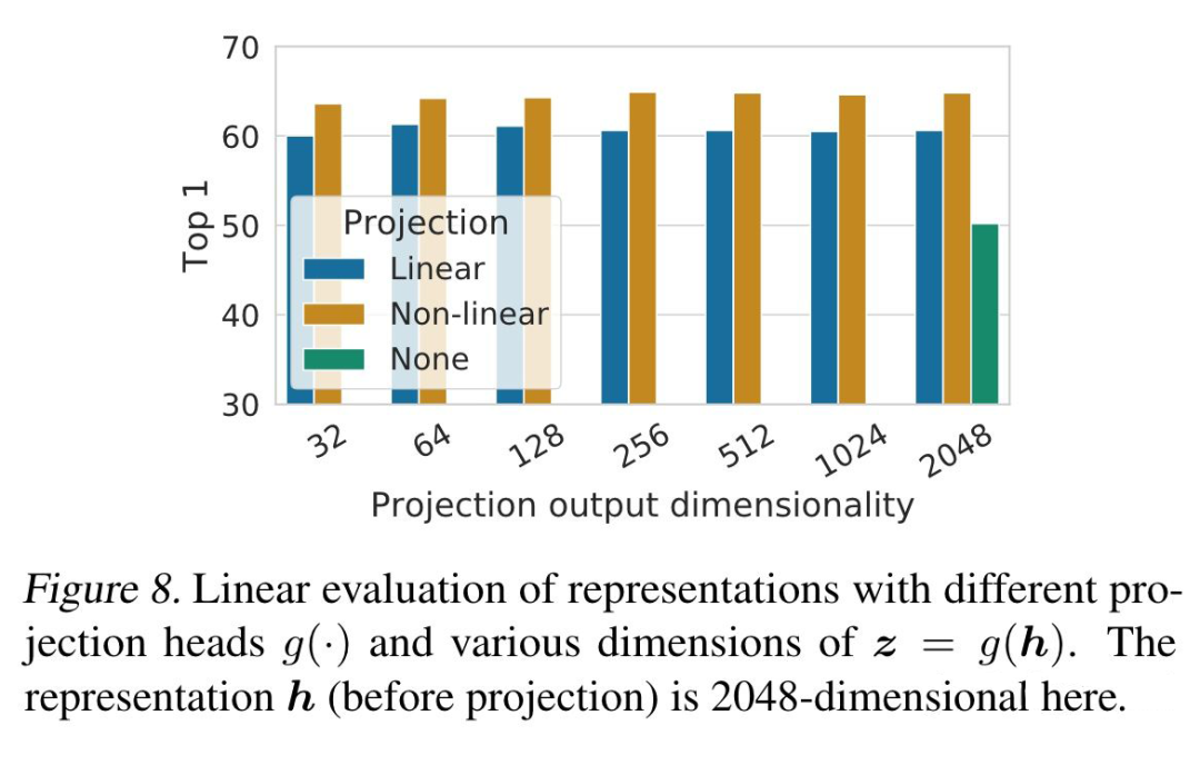 ▲ Furthermore, even when nonlinear projection is used, the layer before the projection head, h, is still much better (>10%) than the layer after, z = g(h), which shows that the hidden layer before the projection head is a better representation than the layer after