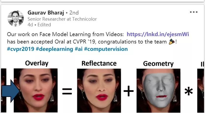 马克斯·普朗克计算机科学研究所、斯坦福大学等近期提出了一种新型的面部三维重建模型,效果惊艳。该模型基于自监督学习,使用了来自 YouTube 抓取的 6000 多个名人的视频片段进行训练;其能以任意帧数重建人脸面部,适用于单目和多帧重建。特别是,该模型可以完全从零开始学习,将面部的多种特征分离再重新组合,结构化程度很高。目前这项工作已被CVPR2019接收。