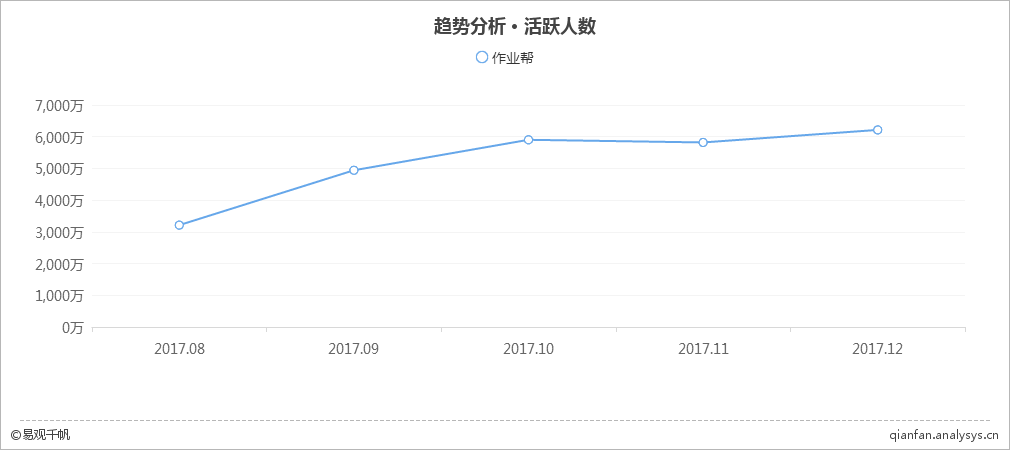 在作业解题类应用中,作业帮主打名校老师在线授课服务来帮助中小学生解决学科难题,快速修炼学霸。在产品迭代上,作业帮在2017年秋天将下学期班课进行了升级,通过分小班、配备班主任等措施,使课下服务更有针对性。此外还陆续增加了群作业、联系功能,课堂标记功能,一对一老师分享等功能,通过产品细节的优化,帮助学生提高复习效率,进而提升了用户体验。从易观千帆数据显示,作业帮的月活跃人数从2017年8月的3212.4万到2017年12月的6214.5万,将近增长了一倍,一直呈上升趋势。