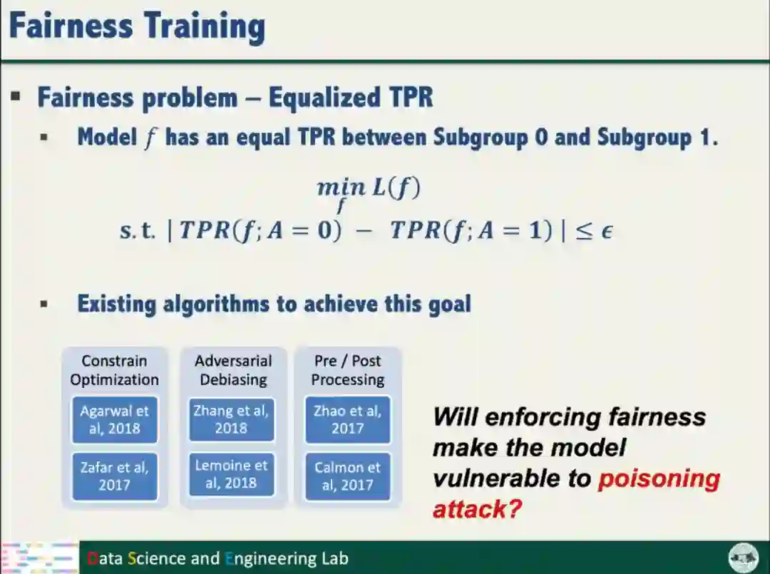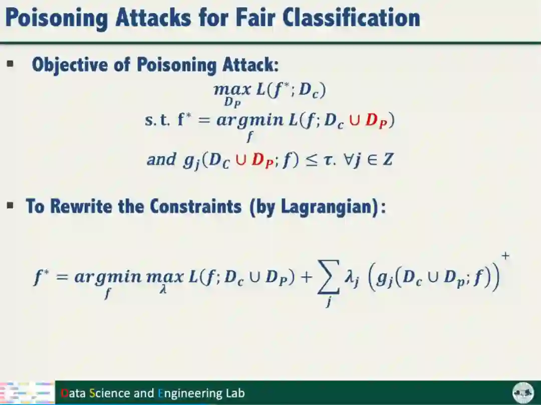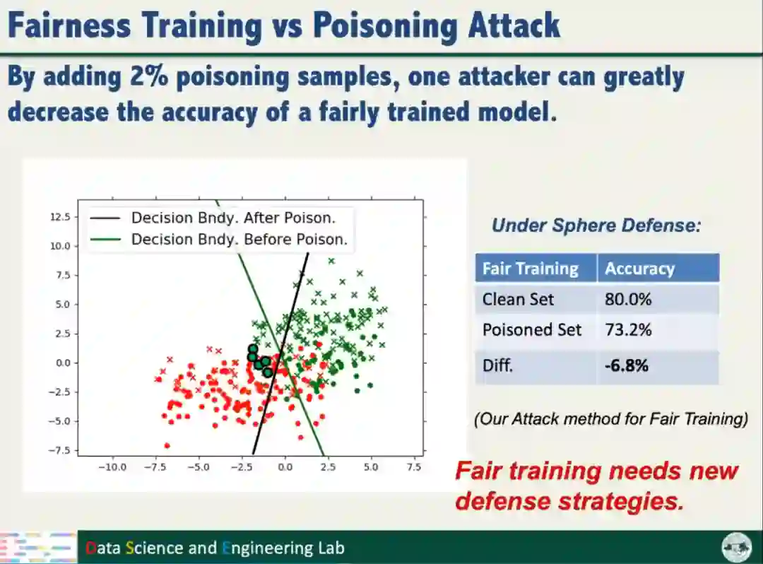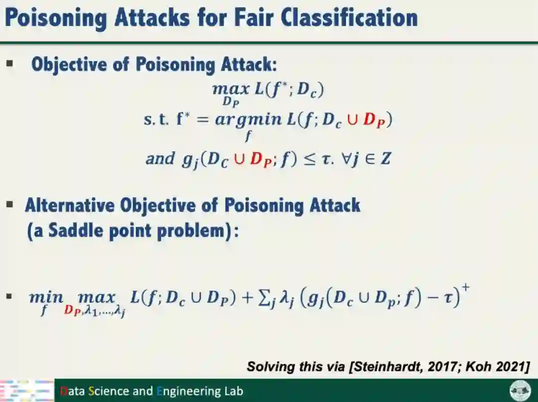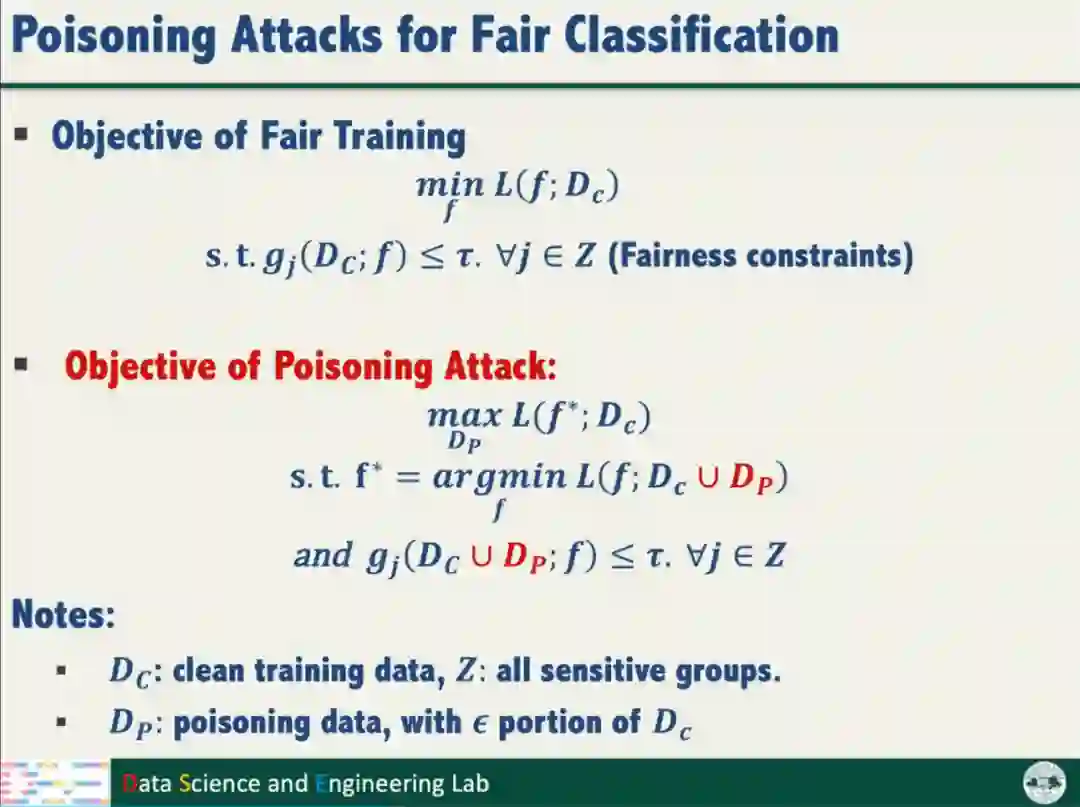 为了探究公平性训练是否降低模型鲁棒性,汤教授开展了投毒攻击对模型公平性的研究。投毒攻击的目标是产生满足公平性约束的有毒数据样本,最大化模型对干净样本的分类损失。