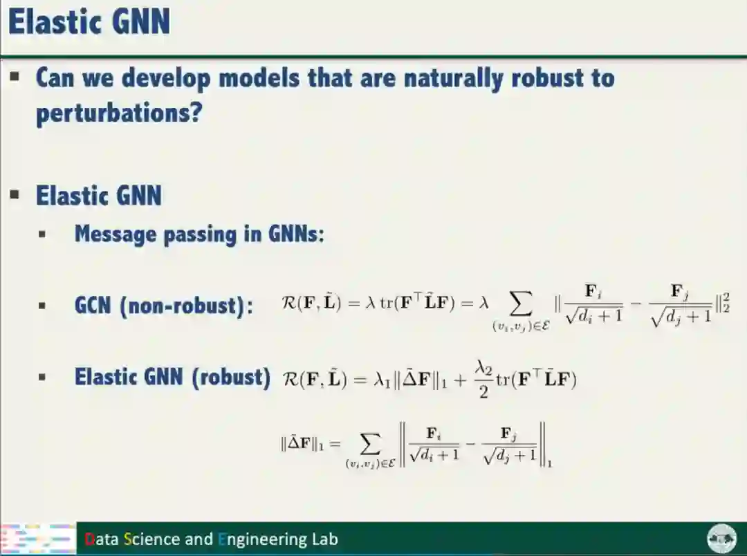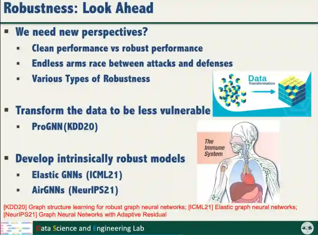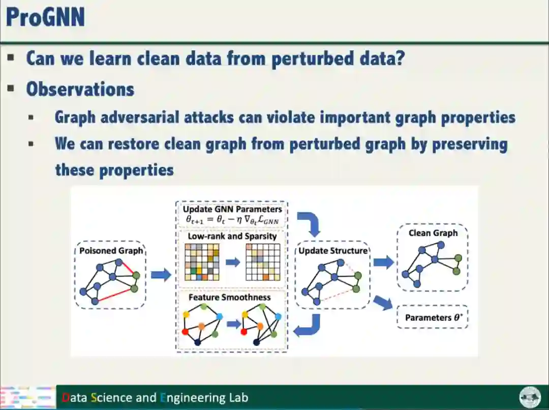 针对数据鲁棒性,汤教授提出了ProGNN,利用图邻接矩阵的低秩和稀疏特性,利用相邻结点的特征平滑特点,从被扰动的数据恢复干净的样本,实现数据的鲁棒性。