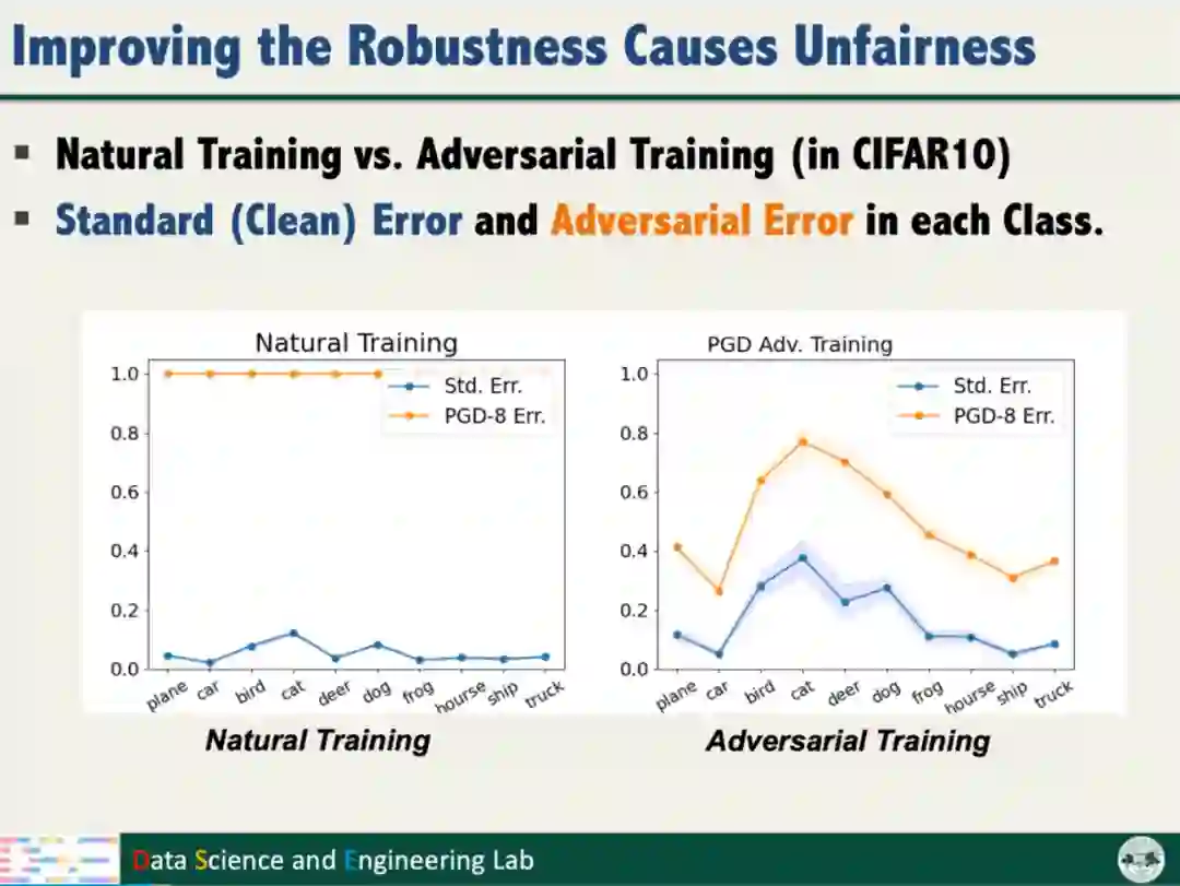 汤教授发现,对抗训练增强模型鲁棒性的同时产生了不公平的问题,即对抗训练对不同类别数据的鲁棒性增益不同,且类别之间的增益差异较大。模型的不公平对智能系统安全和社会伦理带来了潜在的威胁。因此,需要解决以上问题,保障模型鲁棒性的同时不损害模型的公平性。
