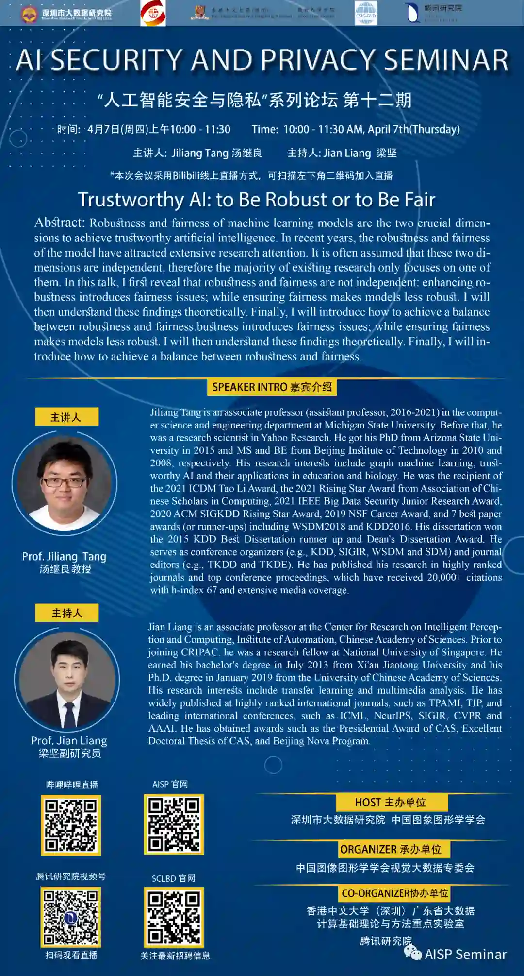 4月7日,由中国图象图形学学会、深圳市大数据研究院主办,中国图象图形学学会视觉大数据专业委员会承办,香港中文大学(深圳)广东省大数据计算基础理论与方法重点实验室、腾讯研究院协办的“人工智能安全与隐私”系列论坛第十二期圆满落下帷幕。此次论坛由中国科学院自动化研究所副研究员梁坚主持,密歇根州立大学的汤继良教授作为主讲嘉宾,围绕可信人工智能的鲁棒性和公平性展开了详细的讨论。