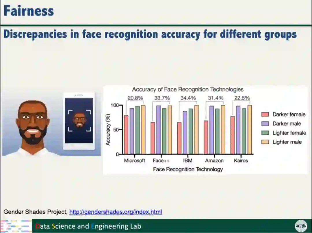 汤继良教授指出,人工智能系统不仅鲁棒性较差,而且存在一定的偏见,可能因为用户的性别、种族、年龄和收入等因素的不同,做出不同的决策结果。以人脸识别系统为例,白人的识别准确率比黑人高,男性的识别准确率比女性高。