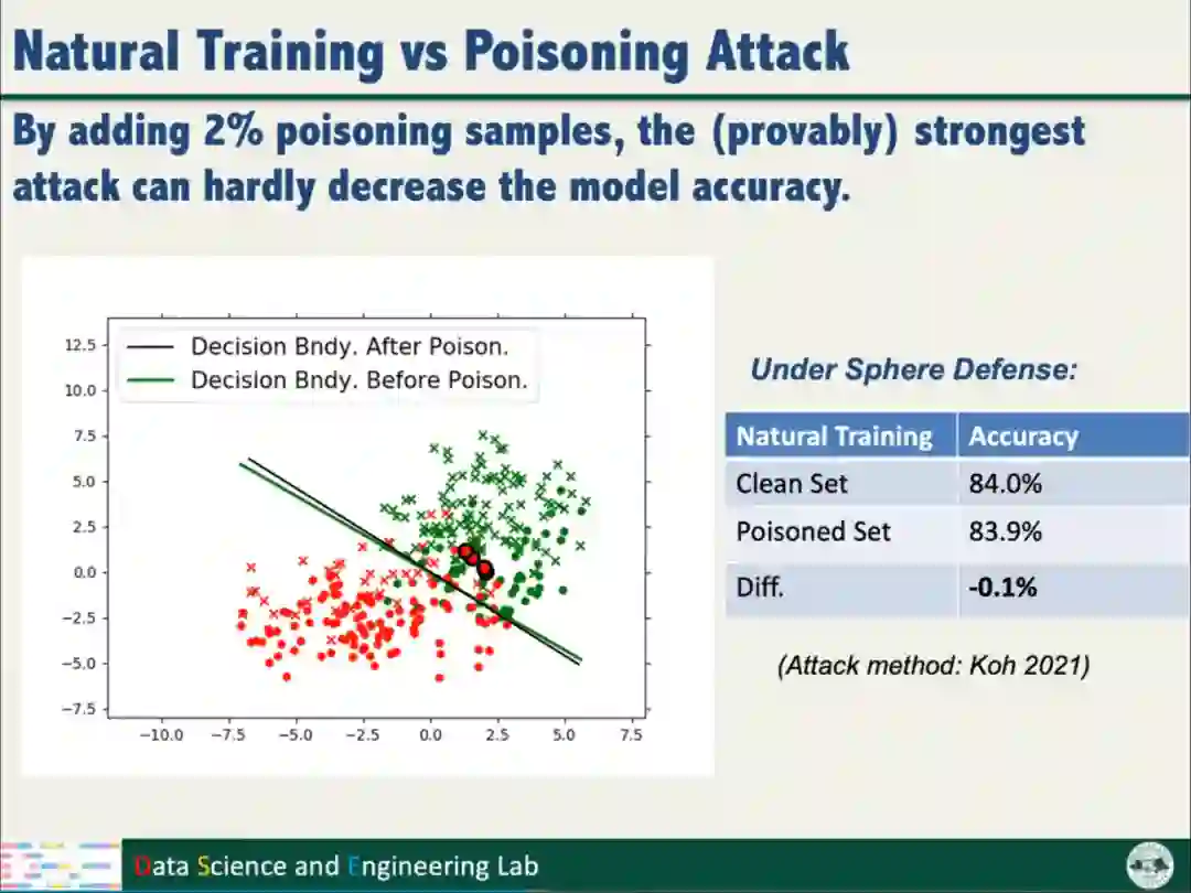 向数据添加2%的投毒数据样本后,采用Sphere Defense防御方法,以Natural training方式训练模型,模型的准确率几乎不变;以Fairness training方式训练模型,判别超平面发生明显的变化,模型的准确率也明显下降。实验表明公平性训练使模型面对攻击变得更加脆弱,需要新的防御策略。