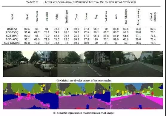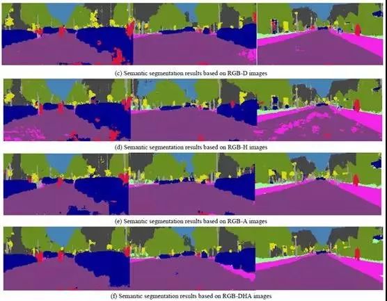 图3显示了我们的网络模型的测试集上的语义分段结果,分别以3通道,4通道和6通道作为输入。如图所示,基于RGB图像获得的分割结果有时是粗糙的,并且在道路上或在不同类别的边界轮廓周围存在许多错误分类的像素。例如,在图3(b)的左图中,路面中的许多像素被错误分类为人行道。基于四通道图像的效果通常比基于RGB三通道图像的效果更好,并且RGB-DHA图像可以进一步提高分割精度,其显示更少的错误分类点。