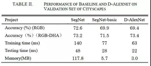我们首先评估了我们提出的网络如何有效地加速语义分割,将SegNet [11]和SegNet-basic [12]作为基线。当将RGB图像和RGB-DHA图像作为输入数据时,网络的性能结果如表II所示。我们提出的网络结构比SegNet快2.2倍,比SegNet-basic快1.8倍。从图2和表II中我们可以发现,我们提出的架构可以通过竞争性分段结果获得更好的实时结果。此外,对于每个网络帧,使用RGB-DHA图像获得的验证精度高于使用RGB图像获得的验证精度,这也表明更多特征信息对于改善网络性能是有用的。