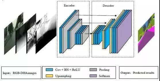 深度传感器的出现使得可以获得深度信息,其包含比RGB图像更多的位置信息。将深度图应用于图像语义分割有两种方法:一种是将原始深度图像和RGB图像组合成四通道RGB-D图像作为CNN输入[2] - [4];另一种是将包含更丰富深度信息和RGB图像的图像分别输入到两个CNN中[5] - [7]。具体地,借助于关于深度图像中提供的对象关系的丰富信息,两种方法都可以实现比仅使用RGB图像更好的性能。但是,将数据输入两个CNN会增加导致网络速度变慢的参数数量。因此,在本文中,为了提高精度,将视差、高度和角度图(DHA)与RGB图像融合成6通道RGB-DHA图并直接用作输入数据。