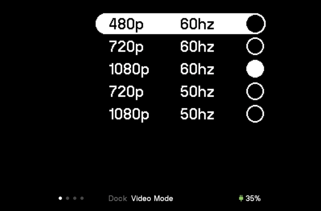 规格上, 除了中间用于放置 Pocket 本体的 USB-C 接口之外,Dock 的后面还有一个标准 HDMI 接口、另一个用于连接电源的 USB-C 接口和两个用于连接有线手柄和其它配件(例如,早期的 Dock 固件需要在这两个 USB 口上插入 U 盘来进行更新)的 USB-A 接口,以及一个手柄配对按钮。为了尽可能简化使用的步骤,Dock 本身只要通电就是一直开启的,并没有电源开关。插入 Dock 并连接大屏幕之后,你会看到 Pocket 的主菜单中出现了一个额外的 Dock 选项,其中可以看到连接的手柄型号,以及选择输出的视频规格,最高为 1080P 60hz。