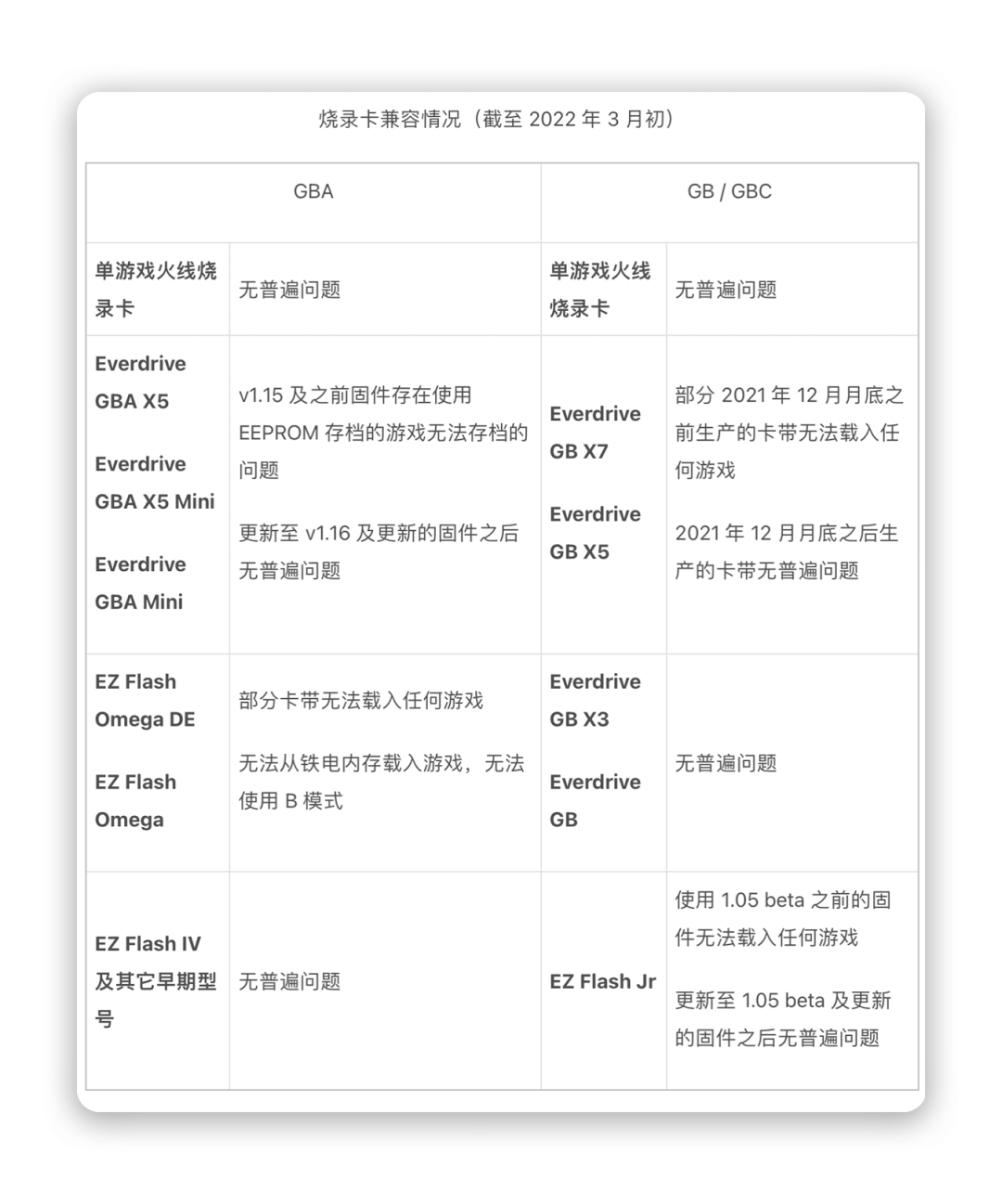 以 EZ Flash 和 Everdrive 为代表的后者价格昂贵、功能繁多,而且通过 SD 卡可以轻松存下整个 GB 时代的游戏,在今天已经成为了经典游戏玩家消费的主流。但是由于这些烧录卡的特点是每次加载游戏时需要从 SD 卡把游戏 ROM 加载到一个临时的内存芯片中,然后重新启动 BIOS,通过 FPGA 或类似技术模拟真实卡带,这多出来的一步在 Pocket 身上就成为了一个大问题。目前最高端的 GB/GBC 烧录卡 Everdrive GB X7 在 Pocket 上有将近一半的概率无法启动游戏,而功能最多的 GBA 烧录卡 EZ Flash Omega DE 在 Pocket 上则无法使用直接加载铁电内存中的游戏模拟成单游戏卡带的「B 模式」。