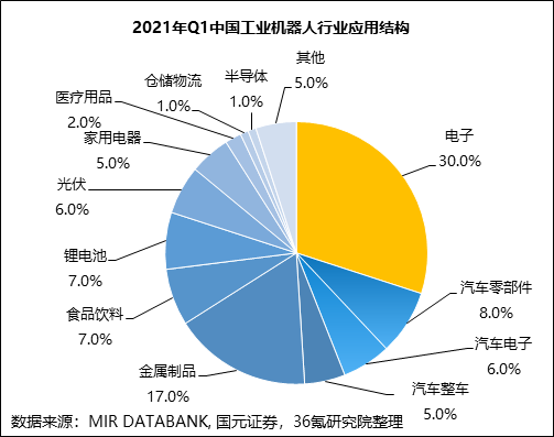 工业机器人终端应用主要集中在电子、汽车、金属加工、锂电池、光伏等行业。根据MIR DATABANK数据,2021年一季度,电子、汽车零部件、汽车电子、汽车整车、金属制品、食品饮料、锂电池和光伏等行业的应用占比分别为30%、8%、6%、5%、17%、7%、7%和6%。