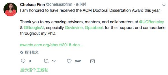 「很荣幸可以获得今年的 ACM 最佳博士论文奖。感谢我的导师和同事在我博士期间给予的支持和友谊,尤其是导师 Sergey Levine(UC 伯克利助理教授)和 Pieter Abbeel(UC 伯克利教授)。
