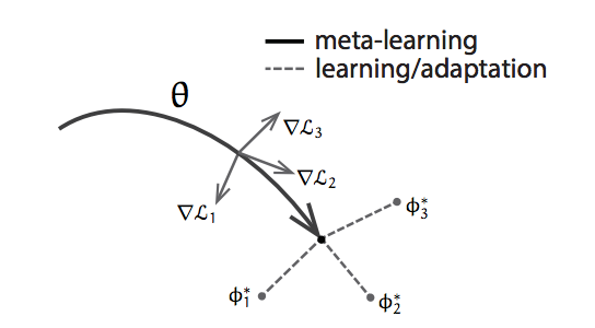 下图展示了 MAML 方法的可视化图,即寻找一组具有高度适应性的参数 θ 的过程。在元学习(黑色粗线)过程中,MAML 优化了一组参数,因此当我们对特定任务 i(灰线)进行梯度迭代时,参数将更接近任务 i 的最优参数 φ_i。