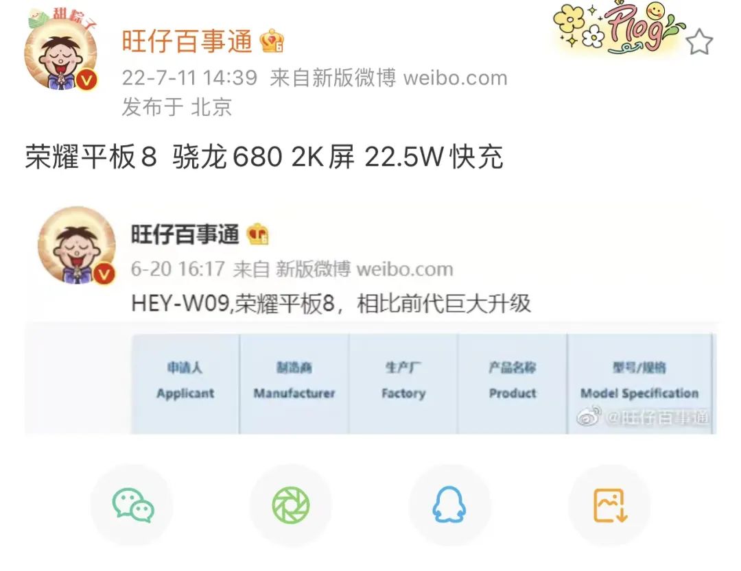 据 @旺仔百事通 今日爆料,荣耀平板 8 将搭载骁龙 680 芯片,采用 2K 分辨率屏幕,支持 22.5W 快充。根据此前爆料,荣耀平板 8 设备型号为 HEY-W09,相比前代有着巨大升级。此外有消息称,荣耀或将在本月举办新品发布会,推出荣耀 X40i、荣耀平板 8、荣耀智慧屏 X3 系列等新品。