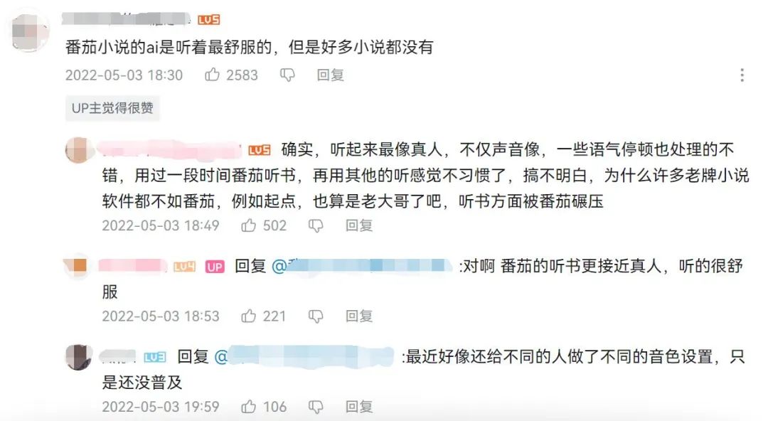 语音合成的 AI 虽然有些地方读法不对,但大多数时候都给人带来了很好的体验。在演示 bug 的视频下也有网友认为,番茄小说的文本朗读是同类 APP 里听起来最舒服的。