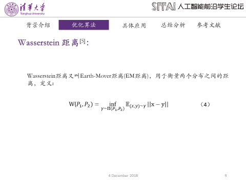 另一种常用的方法是利用概率距离构建分布的不确定集,其中Wasserstein距离[3]是一种常用的度量方式,把一个分布P“迁移”成另一个分布Q所需要的最小距离即为两个分布的Wasserstein距离。Wasserstein 距离不仅可以用在分布鲁棒优化问题中。目前有研究人员把它也用在了生成对抗网络里,解决了很多问题