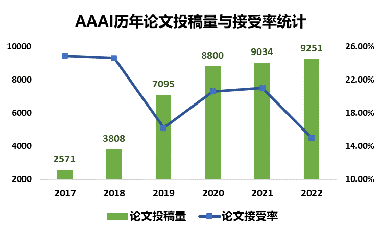 较之历年接受率来说,今年的录取率可以说是断崖式下跌。下图对2017年至今年的投稿量以及接受率进行了可视化,可以说今年的投稿量之多与接受率之低形成了鲜明的对比。