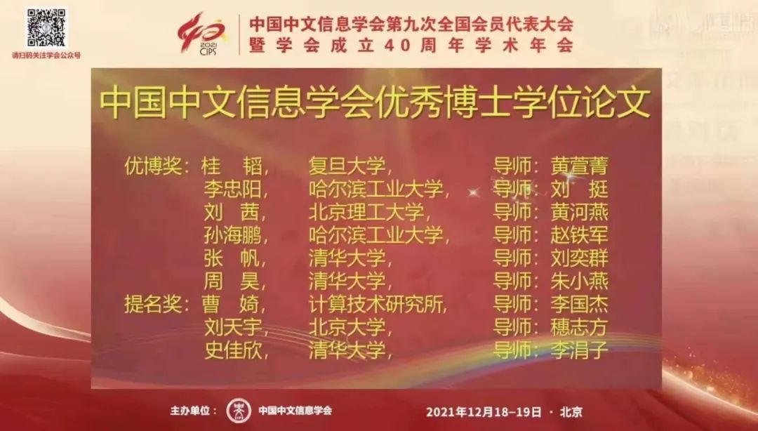 日前,中国中文信息学会公布了2021年中国中文信息学会优秀博士学位论文获奖名单。该评选工作于今年5月启动。经过材料申报、格式审查、专家初审、初审公示及专家终审会,共评出6人获得2021年中国中文信息学会“优秀博士学位论文奖”,3人获得“优秀博士学位论文”提名奖。