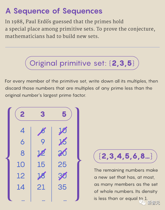 他们观察到,如果原来的集合是本原集,则其相关的倍数序列不会重叠,因此它们的组合密度最多为所有整数的密度。