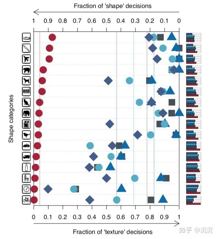 结果不出所料。红色圆圈表示了不同类别下人类对于纹理和形状的偏好情况,不同的蓝色标志表示了不同神经网络架构(AlexNet、VGG-16、GoogLeNet、ResNet-50)的偏好情况。越靠左说明对形状的偏好性越强,反之说明对于纹理的偏好性越强。虽然各类别图像的情况不甚相同,但也很好地支持了前四个实验的结论。