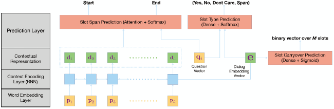 基于文本跨度(text span)的解码器,通过在对话历史文本中选取子序列的方式,直接从对话历史中抽取槽值。如高等人[16]将对话状态跟踪任务转化为抽取式的问答任务,随之提出的DST-Reader模型通过预测子序列的开始和结束从输入的对话文本中抽取槽值。