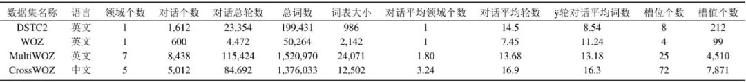 其中,CrossWOZ 是中文任务型对话数据集,DSTC2和WOZ 是单领域任务型数据集。