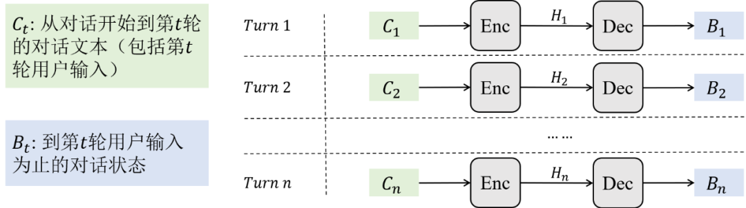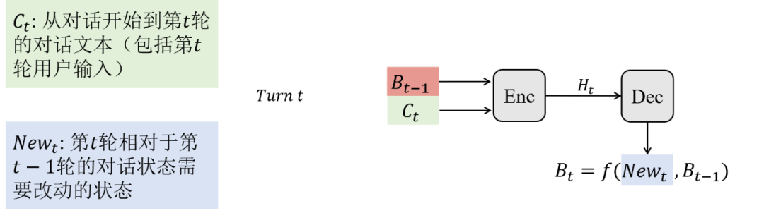 我们将这类方法称为递进方案,如图9所示,递进方案将每一轮的对话状态看作一种明确的数据结构,在生成当前轮的对话状态时不光可以看到对话历史,还可以利用之前轮已生成的对话状态。该类方法可以根据当前轮对话对之前轮的对话状态进行更新,从而更快速地完成对话状态的生成。