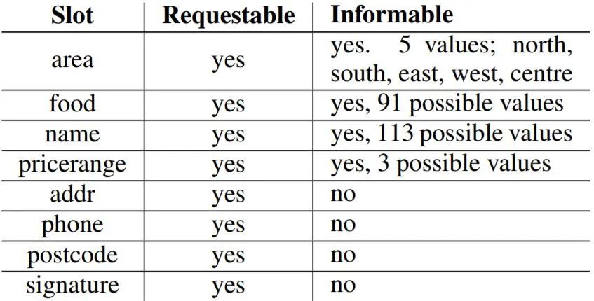 在对话中,用户通过指定约束条件寻找合适的餐厅,也可能要求系统提供某些槽位(如餐厅的电话号码)的信息。数据集提供了一个本体(ontology),其中详细地描述了所有可能的对话状态。具体来说, 中列出了用户可以询问的属性,被叫做可请求槽位(requestable slot),比如餐厅提供的菜品类型或者餐厅的电话号码。它也列出了可以被用户提出作为约束条件的属性及其可能的取值,这些属性被叫做可通知槽位(informable slot)。图2展示了DSTC2中的 的细节。因此,某个对话轮的对话状态被定义为三个部分: