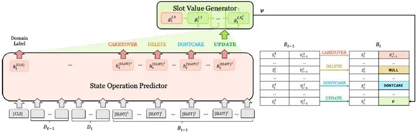 对槽位和对话文本进行表示和特征抽取之后,提取后的特征可以被用来确定针对槽位的操作类别,即状态操作预测。根据不同的槽位更新机制,我们可以将状态操作分为两个大类:面向状态识别和面向状态更新。采用前者的跟踪器注重于从整个对话中抽取状态,而后者更关心状态跟踪的效率提升。