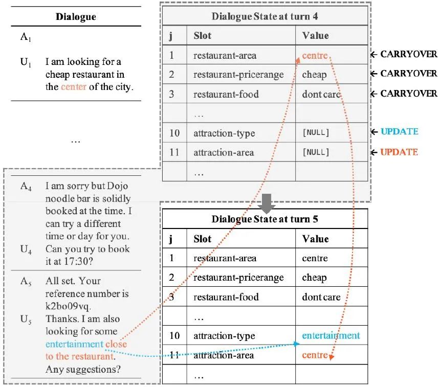 值得注意的是,我们使用“槽位”这个术语表示领域名称和槽位名称的组合,从而包含领域和槽位信息。例如,我们使用餐厅-价格范围而不是价格范围,去表示餐厅领域的价格范围槽位。当对话包含多个领域时,这种格式非常有用,它也被许多之前的研究工作广泛采纳。