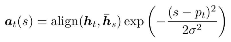 其中 pt 是一个 source position index,可以理解为 attention 的“焦点”,作为模型的参数, D 根据经验来选择(文章选用 10)。 关于 pt 的计算,文章给出了两种计算方案:
