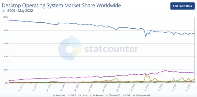 从 2009 年以来,Windows 的市场份额在竞争中不断下降,一方面由于苹果 macOS 带来了强有力的竞争;另一方面,层出不穷的开源操作系统为操作系统市场带来了无限的可能性,这一趋势也就不足为奇了。