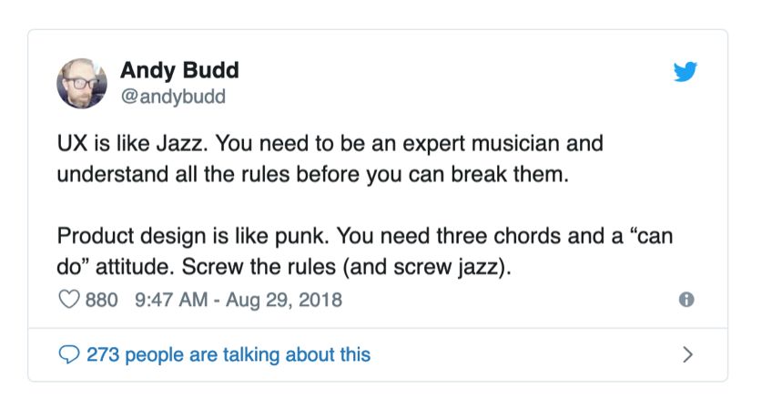 Andy Budd, 一个有着很棒的见解的家伙,我一向很尊敬他,最近他发了一个推特说:UX就像爵士乐,产品设计就像朋克乐。