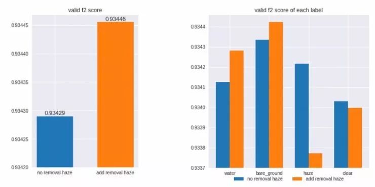 从下图中可以看到,进行去雾处理后,一些标签(例如水、裸地)的F2分数会升高,但同时另一些标签的F2分数(例如雾天和晴天等)会降低。不过不用担心,集成操作能为每个标签选择最强大的模型,总的来说去雾处理会让整体分数得到提升。