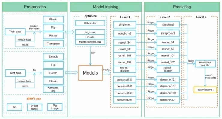 比赛模型集成了包括11种当前流行的卷积网络:融合了不同数量的参数、层数的ResNet和DenseNet,另外还有Inception和SimpleNet模型。在替换了最后的输出层以满足比赛的输出之后,我微调了这些预训练过的CNN的所有层,并且没有冻结任何层。