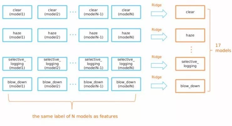 换言之,为了预测晴朗这个标签的最终概率(利用resnet-101模型),有一个特殊的晴朗岭回归模型会接收resnet-101模型对所有17个标签的预测情况。