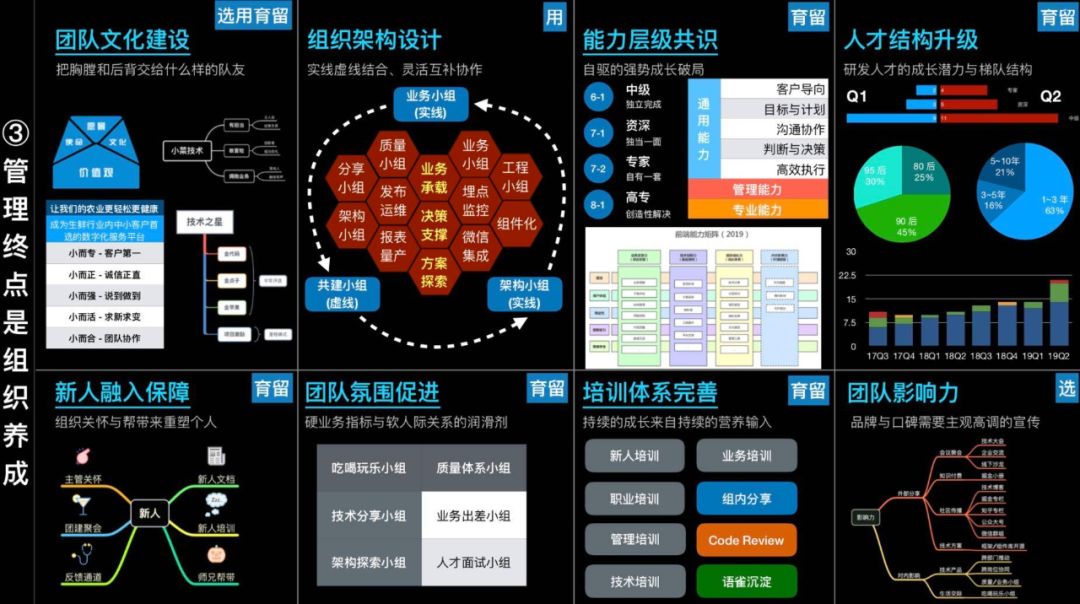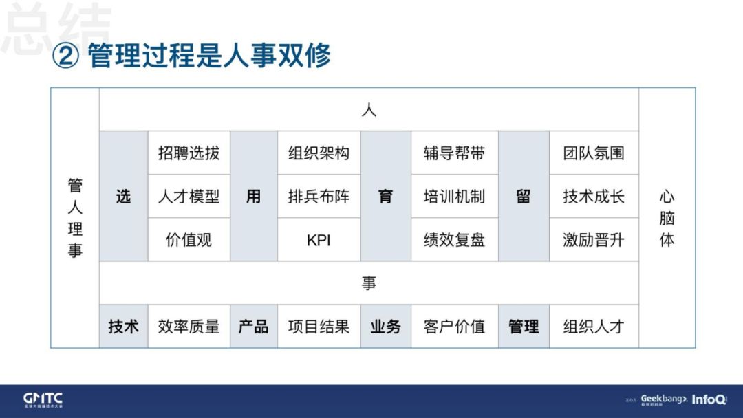 实际上,我们说选育留好像是一个非常虚的东西,它的背后其实是有逻辑的。对于人怎么选、选什么人、做什么事、怎么去定目标,怎么评估?都是要想清楚的,并且对技术、产品、业务以及管理全部要兼顾,在整个过程里面,基于事练就人,基于人成就事,而靠管理智慧链接人和事的关键人物,就是作为管理者的你,最终所谓的人事双修,也是对你而言可以达到心力脑力体力上的综合提升。
