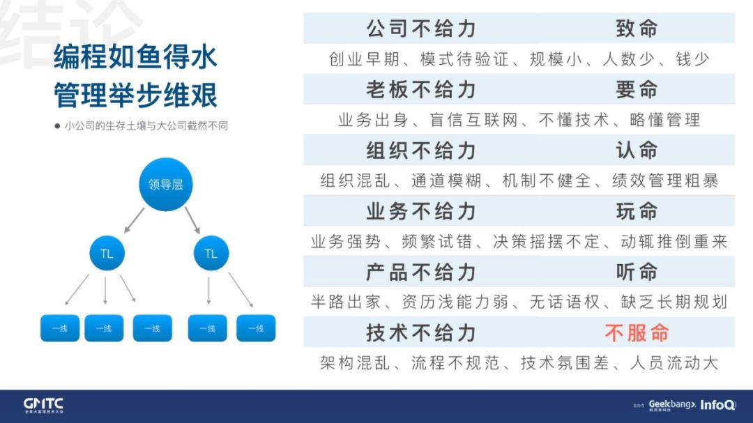 最后万众创业的背景下,诞生了那么多的中小型企业,每天在经历生死存亡各种倒闭的状况下,它们制度体系和晋升空间都参差不齐的,更不要提技术成长的土壤,在这样的环境中做管理,难度大家可想而知。