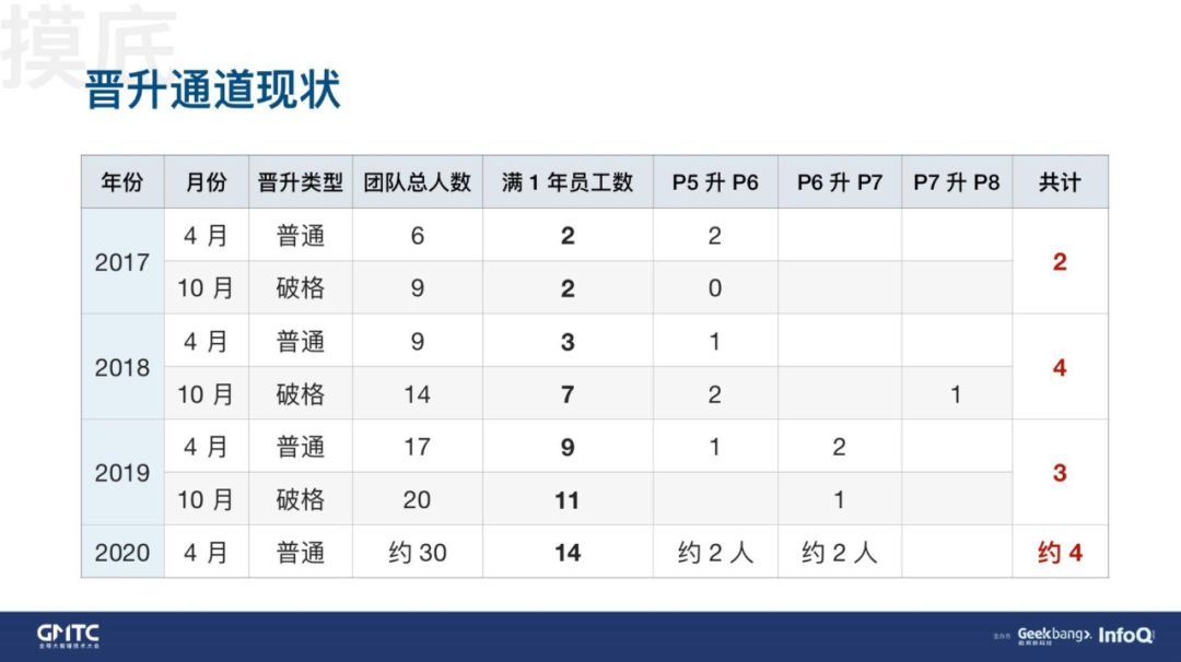实际上,之前我们公司是没有一个明确的晋升通道,只是口头上讲。直到 2018 年底,我们公司终于有了非常完整的一套晋升体系,在过程中包括我以及其他的主管,也都在推动这件事情。我每年都会去做盘点,看团队里面有多少同学可能达到晋升标准,如果这个东西不透明,员工就很容易没有目标。