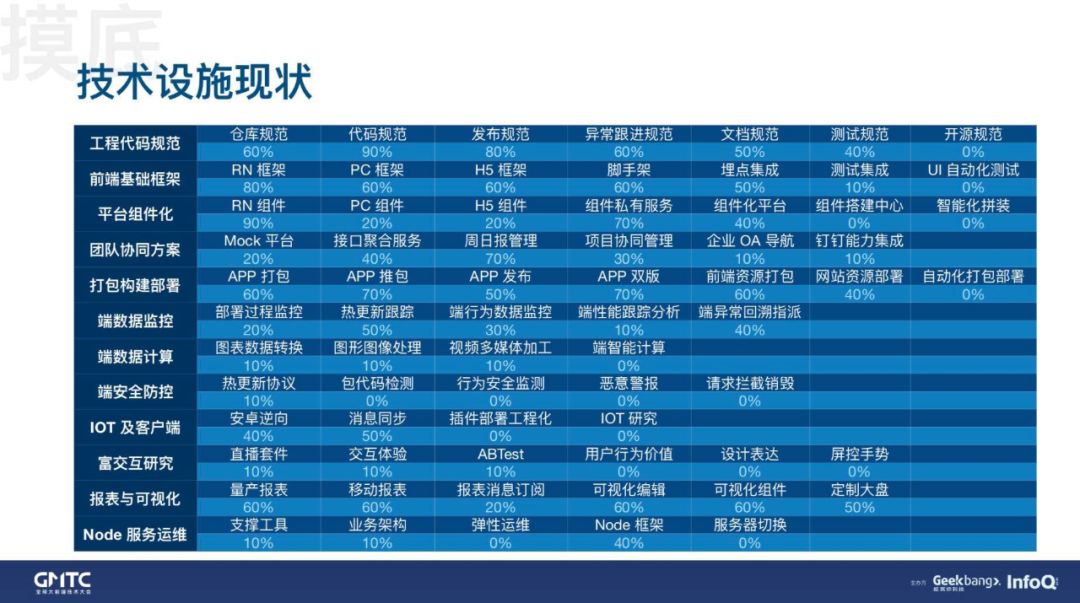 当公司的业务起量或者重大项目并行的时候,经常发现人力瓶颈。实际上,往往就是团队的基建体系不完善导致了生产力无法得到释放。上图是我 2019 年做的一个盘点,各种技术设施我们都有,但是目前很多都只是刚刚起步不久。