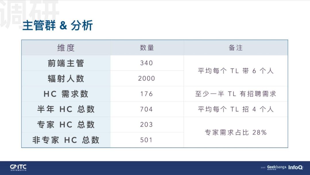 从这张表格可以看到,340 个前端主管,所带的人数全部加起来超过 2000 人,也就是说,平均每个主管带 6 个人左右。其中,在作为样本的 170 多个前端主管里面,他们未来半年要招聘的总人数是 700 多人,而对于专家的诉求,实际上的需求占比差不多 30%。