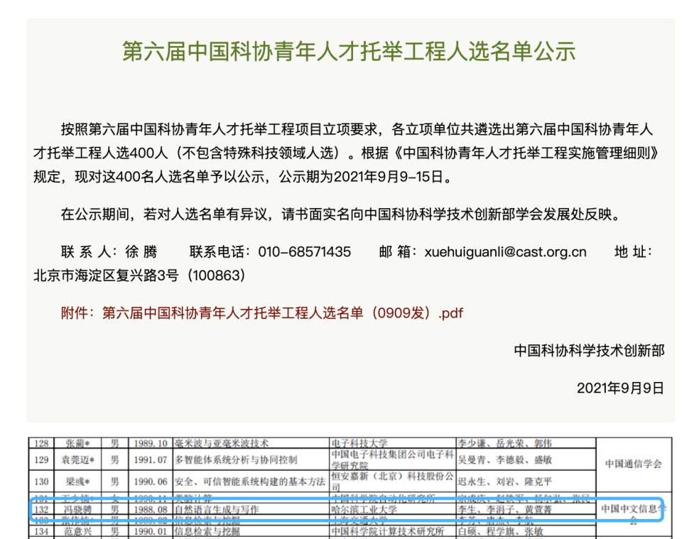 4. 哈工大SCIR 冯骁骋副教授入选第六届中国科协青年人才托举工程