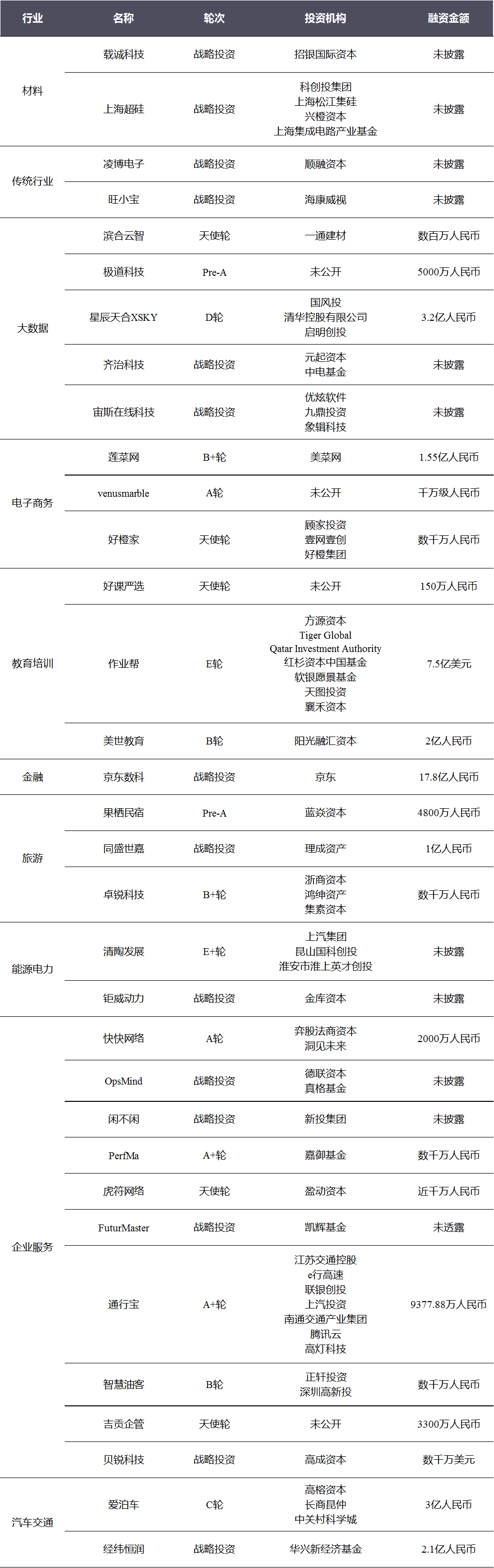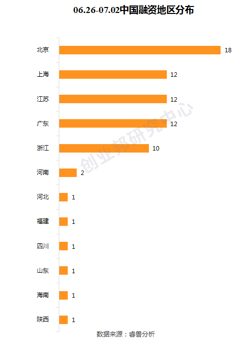 本周北上广融资事件共42起,占比58.33%;江苏有12起事件,与上海、广东并列;浙江有10起事件。