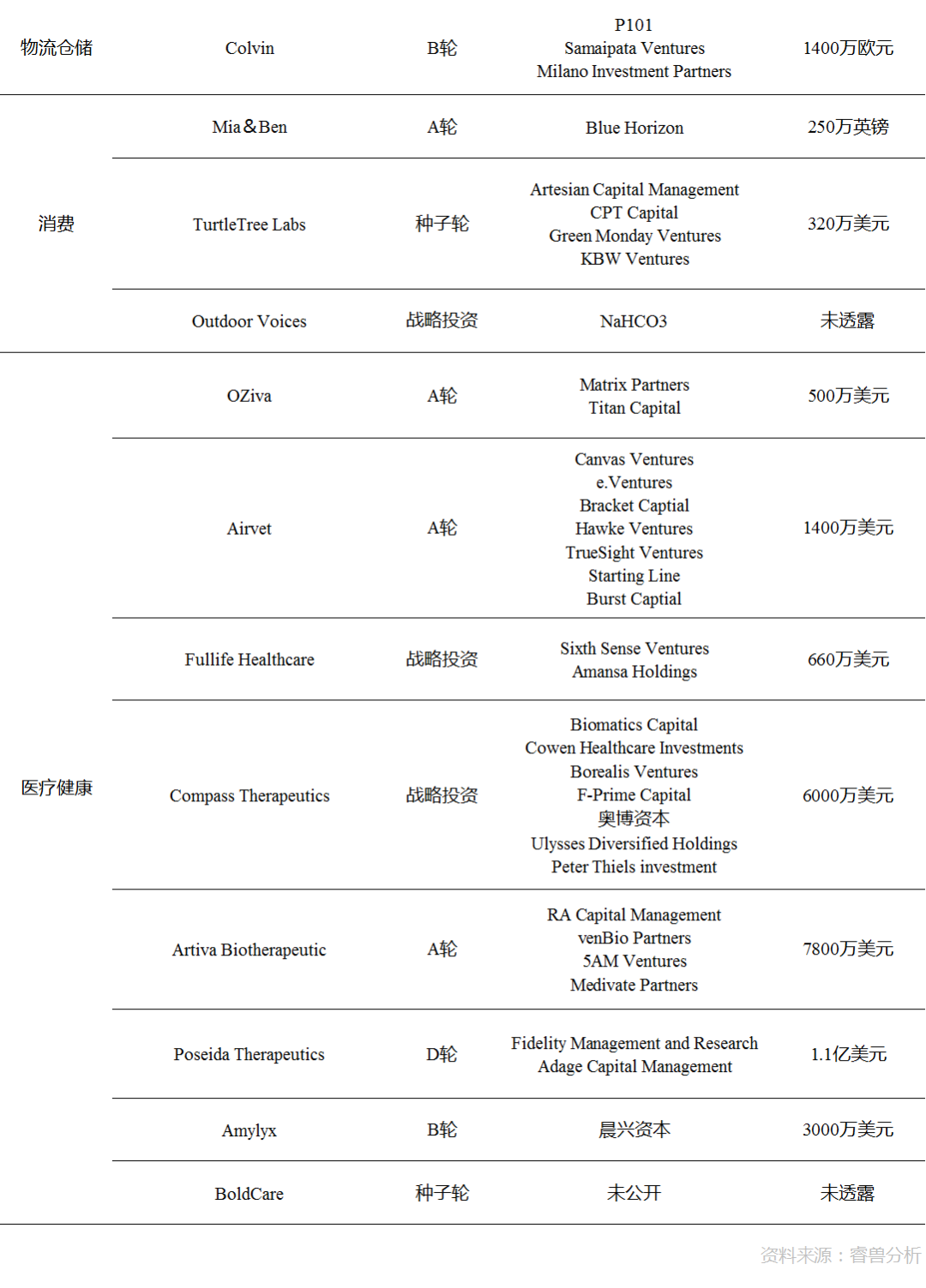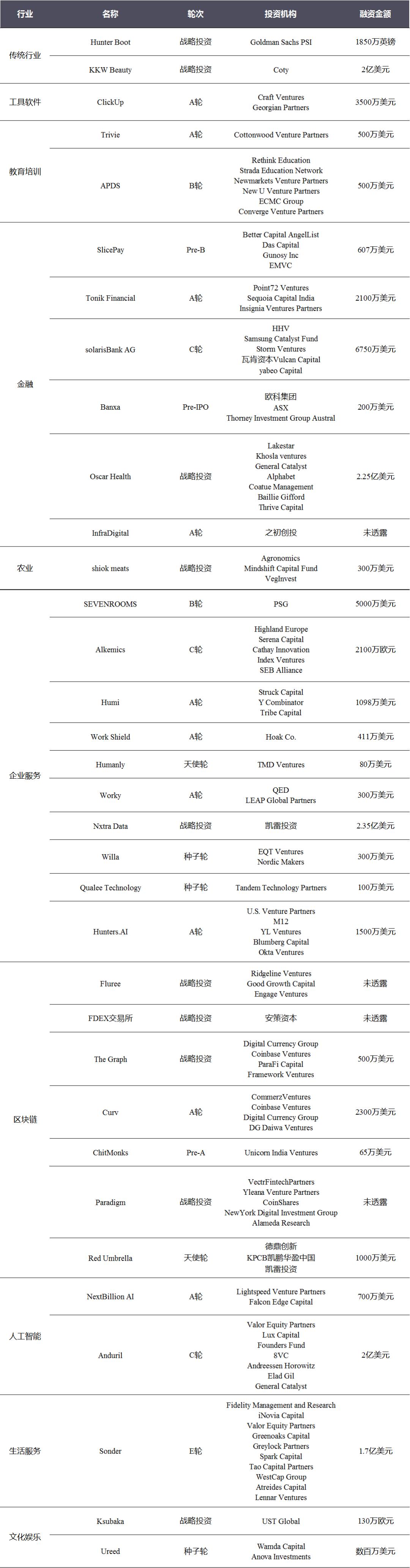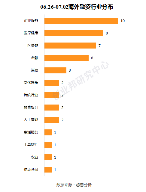 本周披露海外融资事件涉及13个行业领域,其中企业服务10起,医疗健康8起,区块链7起,金融6起,消费3起。