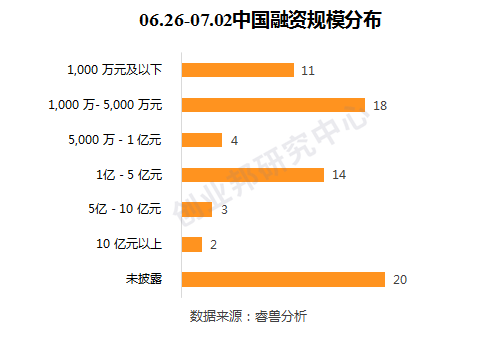 本周融资事件的融资规模在1,000万-5,000万元的数量最多,有18起。